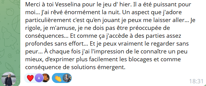 Le jeu, pratiqué dans une ambiance de bienveillance et d'intelligence, m'a permis de mettre en lumière des vérités profondes via la dimension du coaching métaphorique - dont les révélations, magiques d'exactitude, ont surpris chacun des participants.