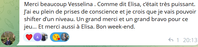J'ai été sensible à la capacité de Vesselina à créer un climat d'exploration à la fois sérieux et joyeux, qui a permis des partages sincères entre nous tous.